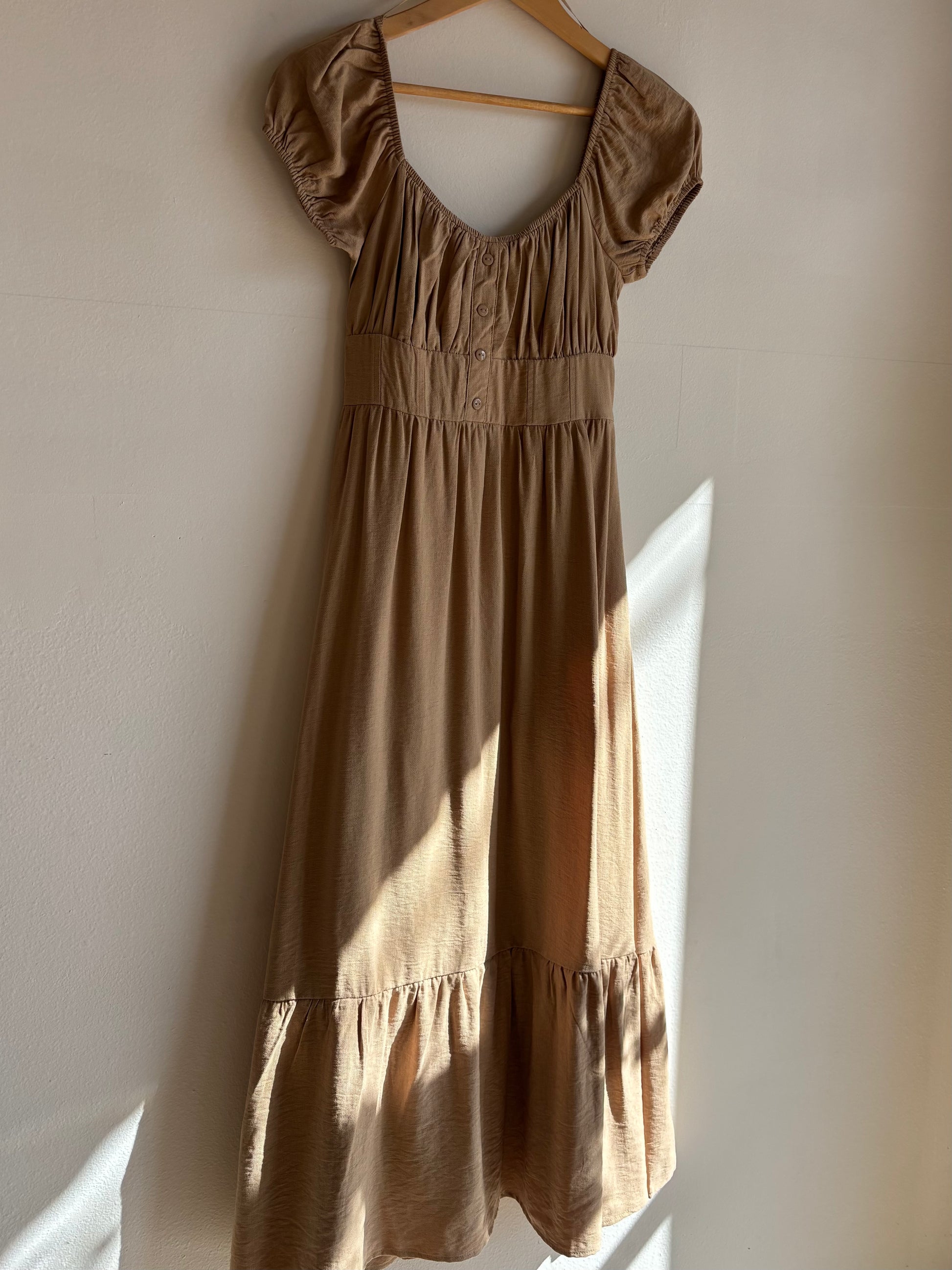 Khaki Front Button Short Sleeve Midi Dress